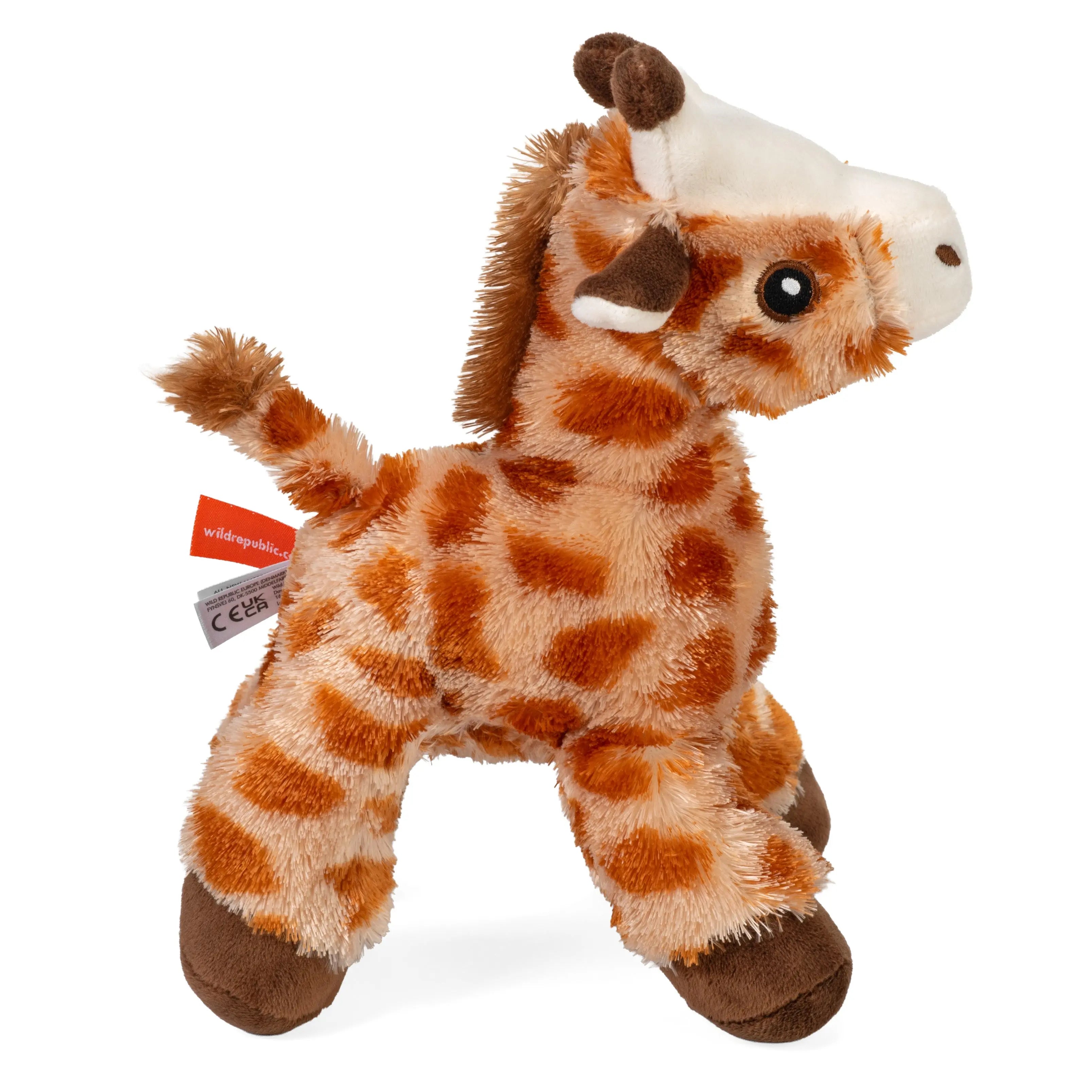 Wild Republic's Ecofuzzies Giraffe is a heartwarming blend of playful design and eco-conscious craftsmanship. With its gentle eyes, long neck, and distinctive spots, this plush captures the elegance of the giraffe in a cuddly form. Crafted using fabric and fill made from recycled water bottles, it's both soft to touch and kind to the planet. Its floppy design and extra fuzzy texture make it the perfect ecofriendly companion for both kids and grown-up animal lovers.