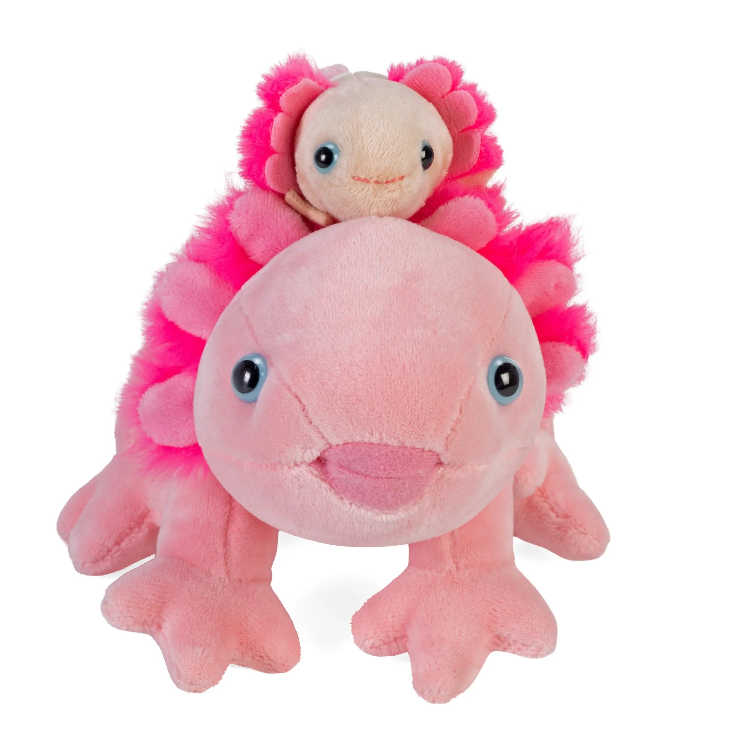 Wild Republic Mom & Baby Axolotl celebrates the sweet bond between a parent and little one in a cuddly, display ready pose. The baby is attached at retail for an adorable look, then can be detached at home for extra imaginative play and storytelling fun. Soft and huggable at 9 inches, it is perfect for bedtime snuggles, travel, classrooms, and gifting to axolotl fans of all ages. This charming duo brings warmth to any collection and makes a lovely nature themed gift. Filled with spun recycled water bottles, it is a feel good plush for kids and adults.